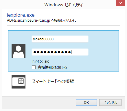 ユーザ名欄には、学情センターのアカウント名の頭に「SIC\」を付けたもの、あるいはアカウント名に「@sic.shibaura-it.ac.jp」を付けたものを入力します。