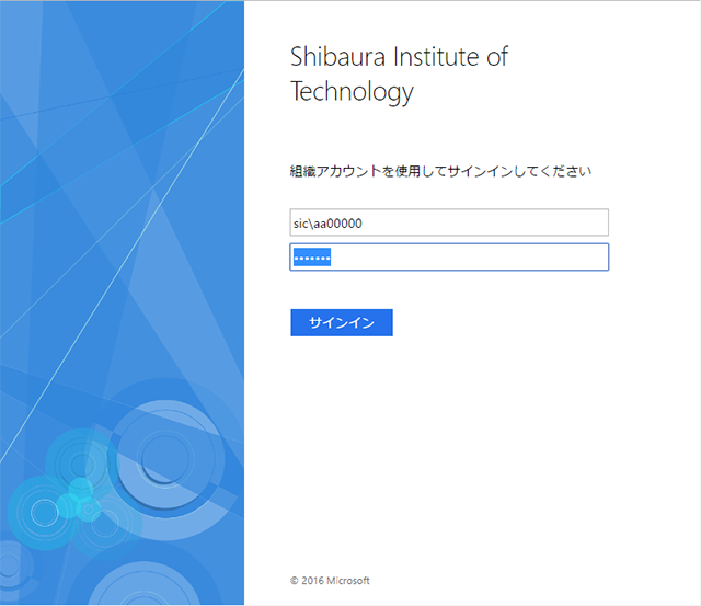 ユーザ名欄には、学情センターのアカウント名の頭に「SIC\」を付けたもの、あるいはアカウント名に「@sic.shibaura-it.ac.jp」を付けたものを入力します。